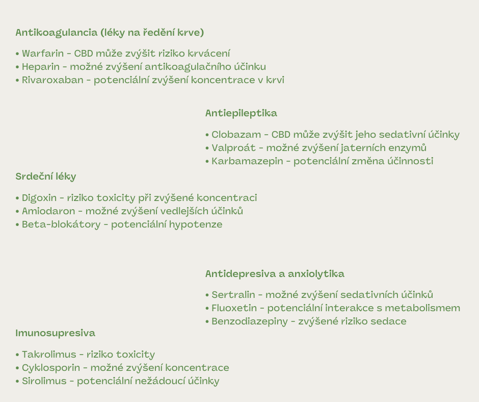 Když CBD tyto enzymy inhibuje, může to vést ke zvýšené koncentraci léků v krvi, což může způsobit nežádoucí účinky nebo toxicitu.